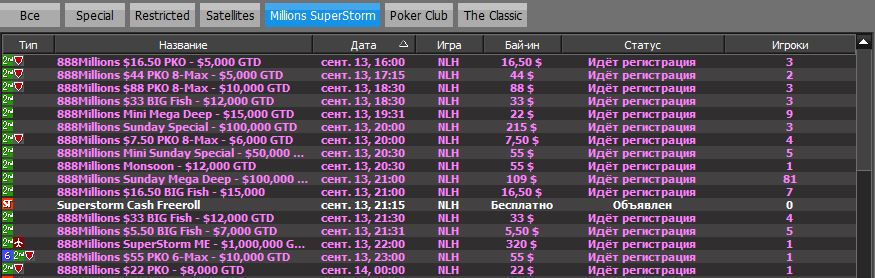 Вечерняя воскресная загрузка Millions SuperStorm на 888poker включает 16 событий с бай-инами от $5,50 до $215. Все турниры по Холдему, пять в формате PKO.