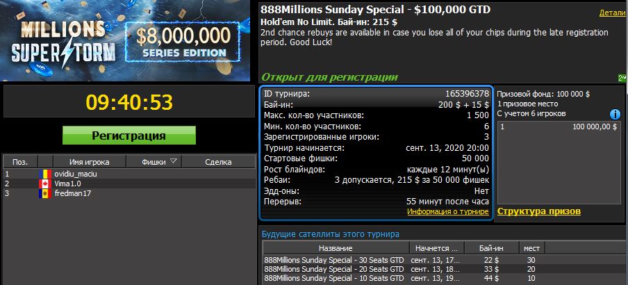Главное событие вечера $215 888Millions Sunday Special $100.000 GTD стартует в 20:00 МСК.