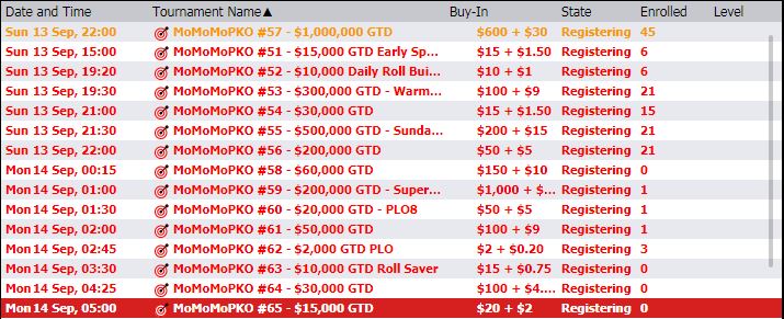 Воскресная загрузка MoMoMoPKO на PokerKing включает 15 событий с бай-инами от $2,20 до $1050. В расписании один миллионник $630 MoMoMoPKO #57, старт в 22:00 МСК. Большинство турниров по Холдему, но есть одно событие по PLO с бай-ином $2,20 и гарантией в $2.000 и одно событие по PLO8 с бай-ином $55 и гарантией $20.000.