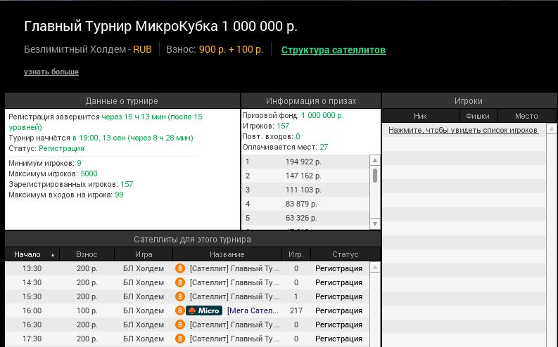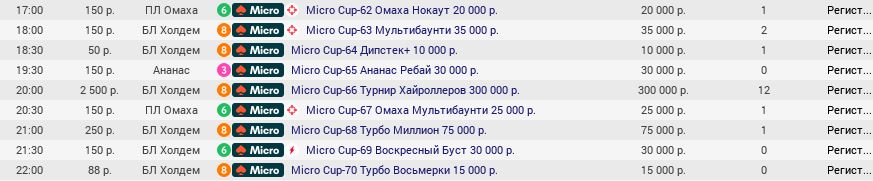 Главный турнир Микрокубка с бай-ином 1000 рублей ($13,35) и гарантией в 1.000.000 рублей ($13.350) стартует в 19:00 МСК.