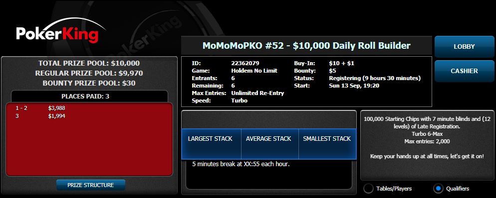 Обращайте внимание на особенности событий. Информации о скорости турнира и формате стола нет в общем лобби, но есть в окне лобби турнира (справа под кнопками «Lobby» и «Cashier»). Например, $11 MoMoMoPKO #52 пройдём в формате 6-макс турбо с уровнями по 7 минут (поздняя регистрация 12 уровней).