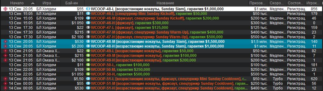 Воскресное расписание WCOOP на PokerStars включает 18 событий в трех разных диапазонах бай-инов от $5,50 до $5,200. Расписание состоит из специальных версий воскресных турниров Sunday Slam, Sunday Kickoff, Sunday Warm Up. Также включены события по Омахе Хай-Лоу с бай-инами $22, $215 и $2.100. Главные события стартуют в 20:05: