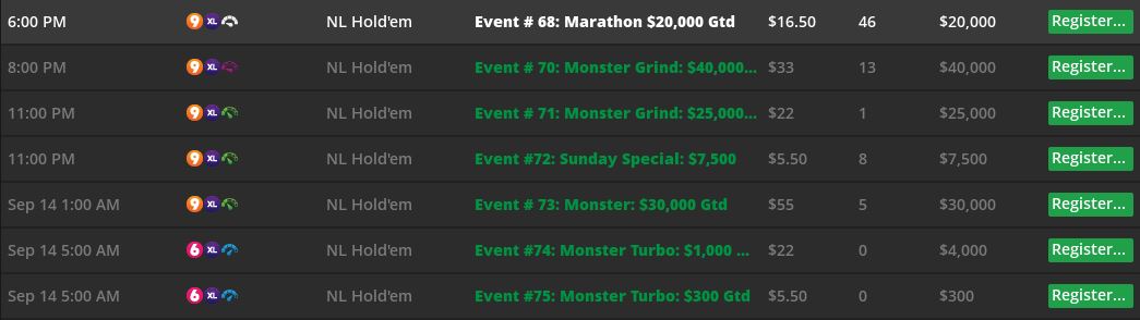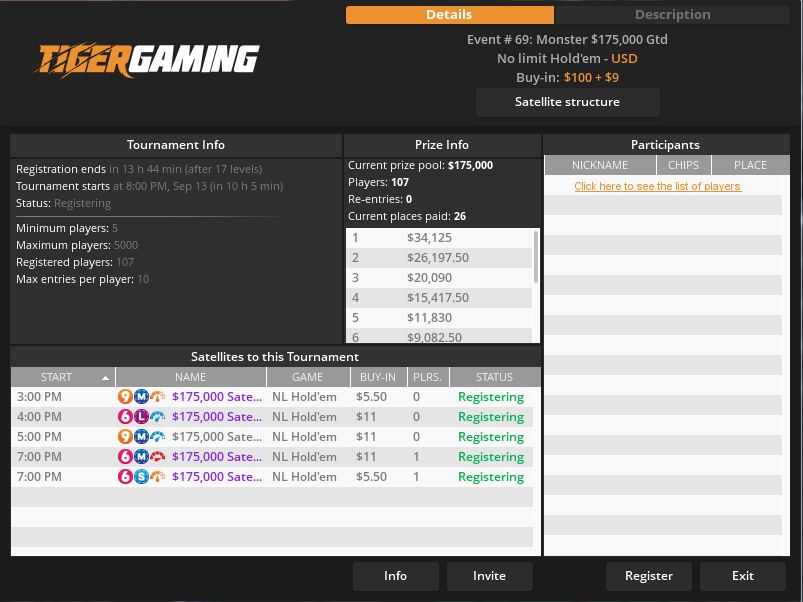 Воскресная загрузка на TigerGaming стартует в 18:00, оканчивается в 05:00 следующего дня и включает 8 событий с бай-инами от $5,50 до $109. Все турниры по Холдему. Главное событие вечера $109 Event #69: Monster $175.000 GTD стартует в 20:00.