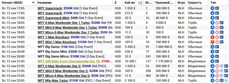 Воскресное расписание WPT на partypoker включает 18 событий с бай-инами от $11 до $10.300, причем 10 событий с бай-ином выше $215. Бай-ины не самые демократичные, зато есть очень много сателлитов. В расписании только турниры по Холдему.