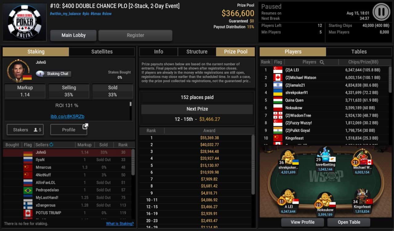 Стеки оставшихся игроков в браслетном турнире по Омахе