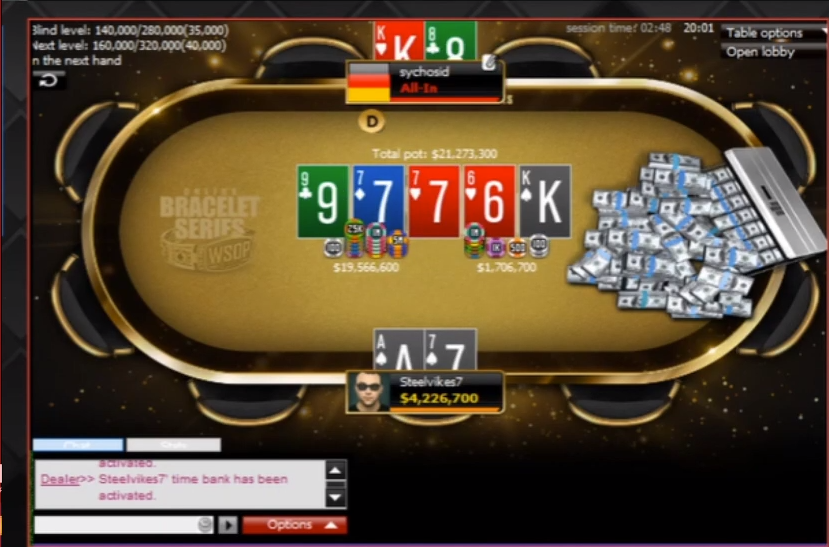 В финальной раздаче турнира игроки вышли на флоп 977 радуга, и Steelvikes7 поставил три барреля. Тёрн 6 и ривер K не закрыли ни один флеш. У победителя были A7s, а оппонент заколлил с K8o.