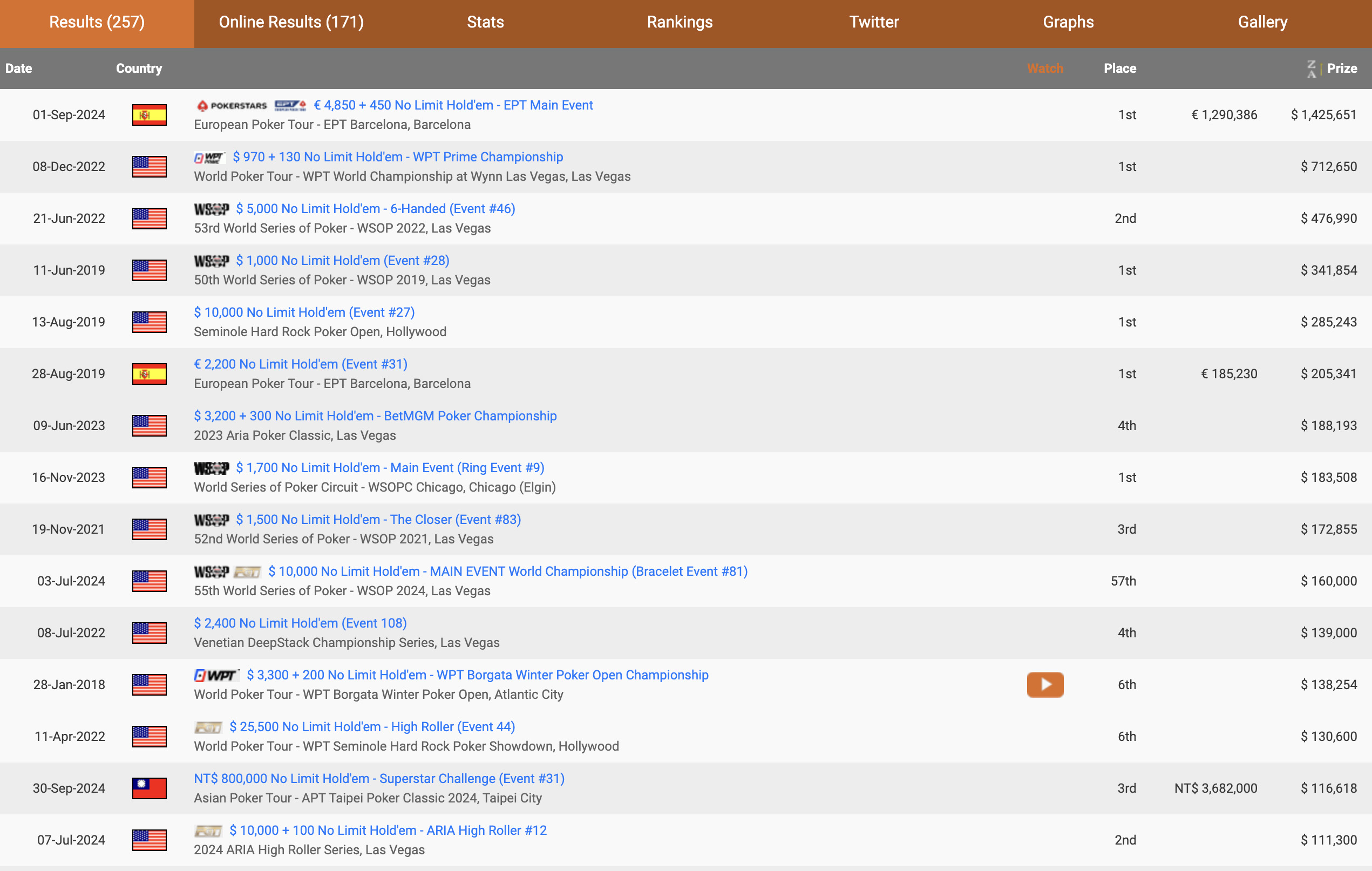 В офлайне Стивен Сонг оформил $8,093,071 призовых с бест-кешем в $1,425,651 на EPT Barcelona Main Event 2024.