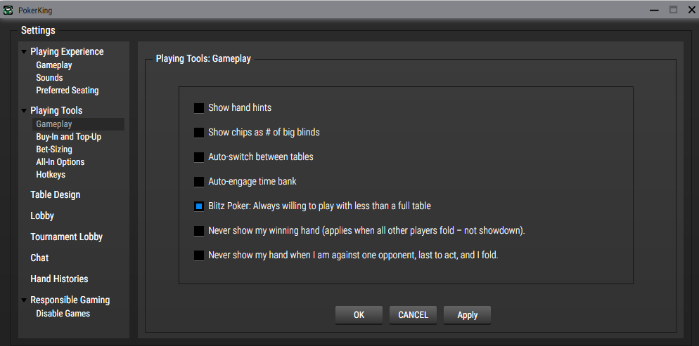 Игру за неполными столами в Blitz и Cyclone можно настроить в Settings — Gameplay — Blitz Poker: always willing to play less than a full table.