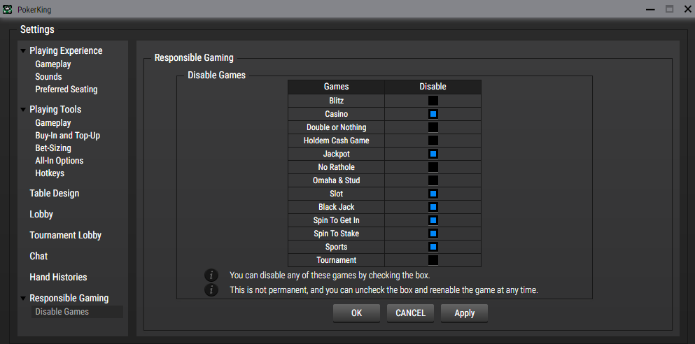 Правда, вернуть игры можно точно так же, сняв отметки — игры сразу же возвращаются в лобби. Например, на PokerStars нужно выждать 24 часа, чтобы дождаться возвращения игр в лобби. Игрокам обещали настроить лимиты кеш-игр и максимальный размер бай-инов, но пока этого сделать нельзя.