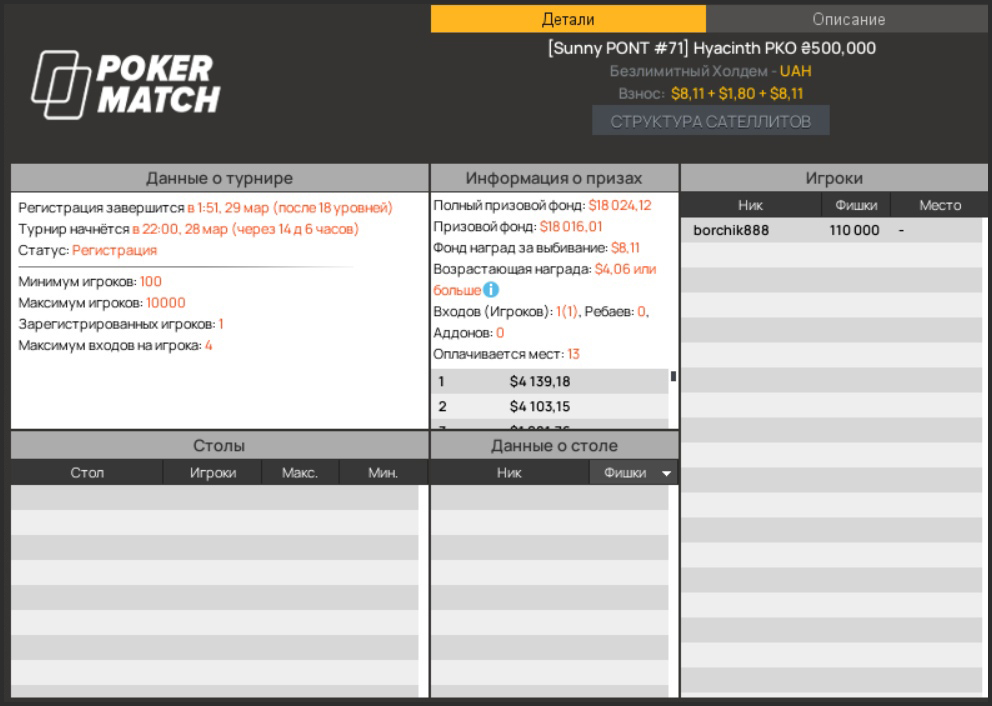 - Стартовый стек — 550 ББ при регистрации до начала турнира / 500 ББ после.