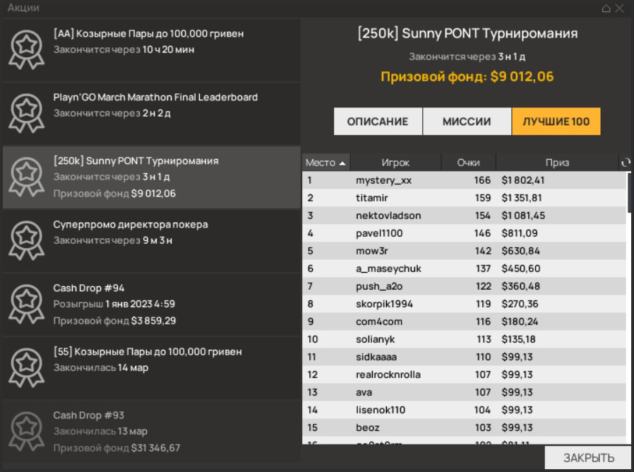 Во время серии в руме действует лидерборд на $9K. Очки в него начисляются за выбивание игроков в турнирах Sunny PONT, причем количество очков зависит от бай-ина турнира: