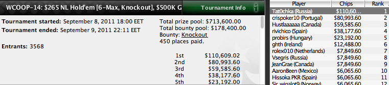 Буквально несколько минут назад, Татьяна Рыжкова выиграла 14-ый турнир PokerStars WCOOP по Безлимитному Холдему 6-макс с нокаутами за $200+50+15. Главный приз двухдневного турнира составил $110,609!