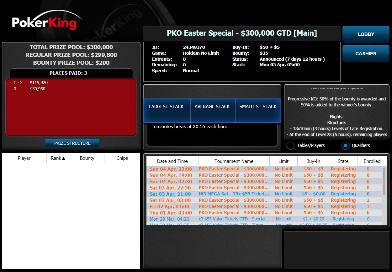 C 1 по 4 апреля пройдет 7 флайтов. Если игрок выживет в нескольких из них, то в Day 2 он перейдет с наибольшим стеком, а баунти аккумулируются. Сателлиты во флайты стартовали 28 марта, бай-ины составляют от $1.40 до $8.80.