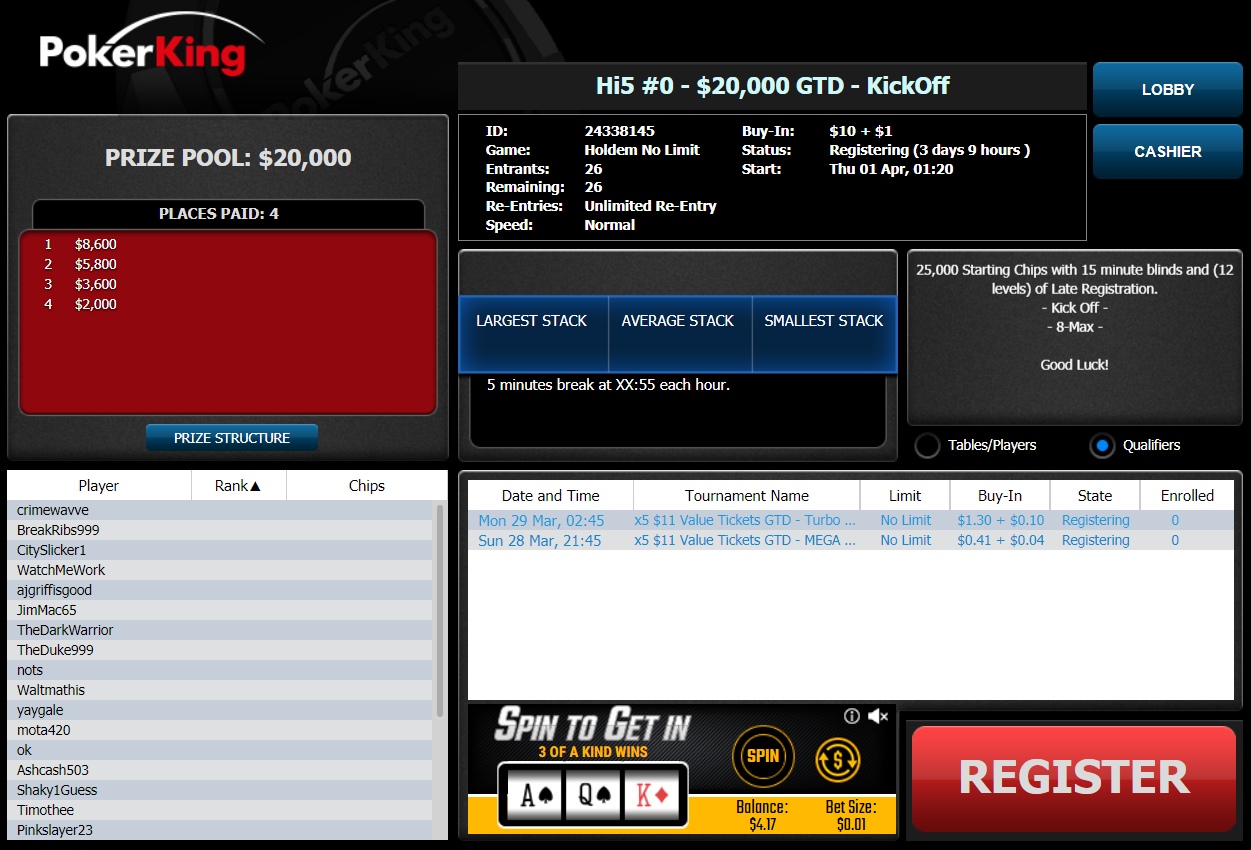 Откроет серию $11 Hi5 $0 KickOff $20K Gtd. Он стартует 31 марта в 23:20 МСК, поздняя регистрация продлится 12 уровней по 15 минут. Сателлиты в него стоят $0.44 и $1.40.