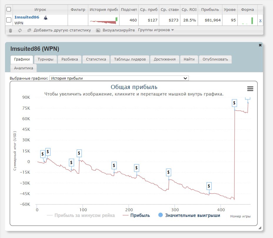 Теперь плюс Imsuited86 по SharkScope лишь немного не доходит до $82K по итогам 460 турниров ABI$237.