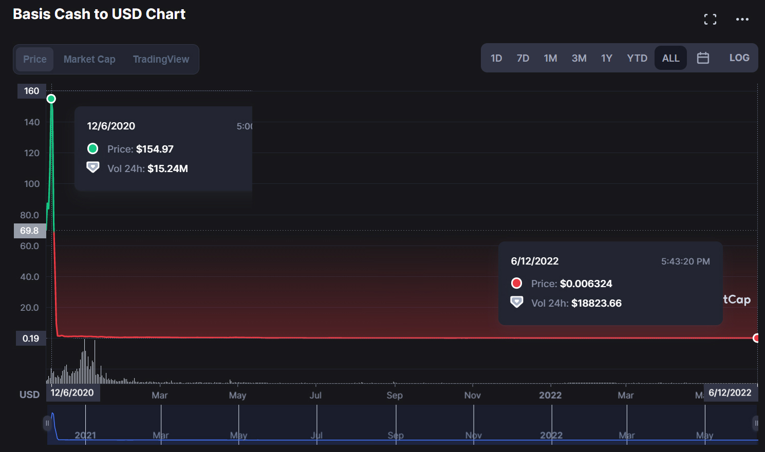 - С 12 декабря 2020 по 12 июня 2022 Basis Cash больше никогда не растёт: его курс на 16:00 МСК 12.06.2022 находится на отметке $0.006.