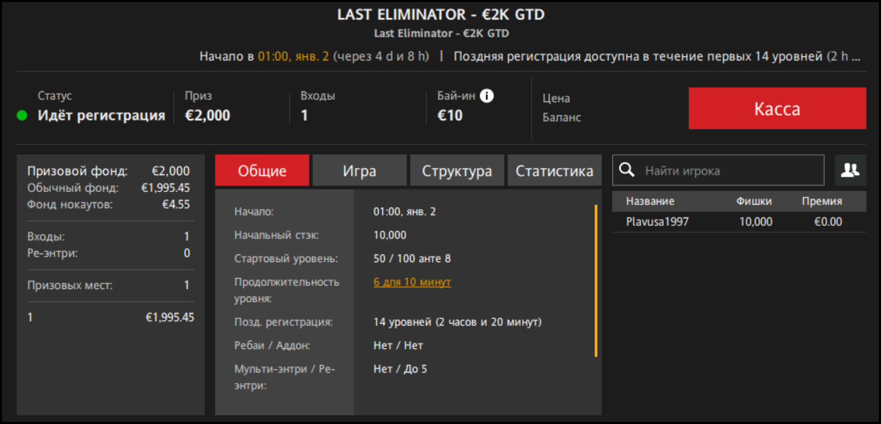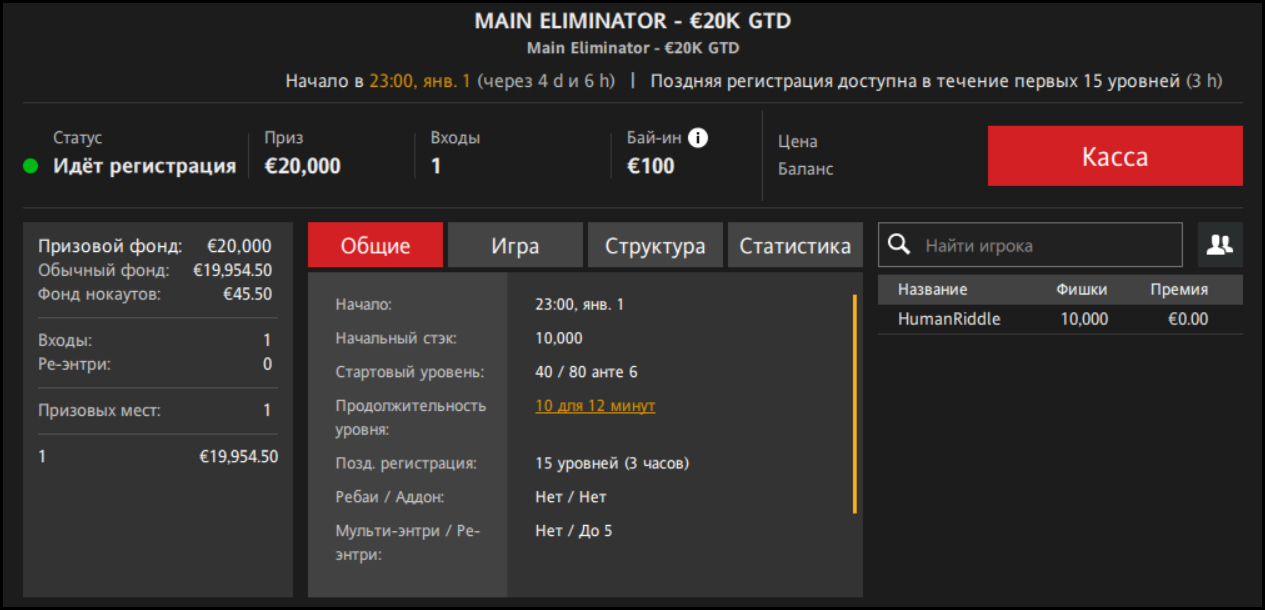 21:00 МСК — €100 Main Eliminator €20K Gtd