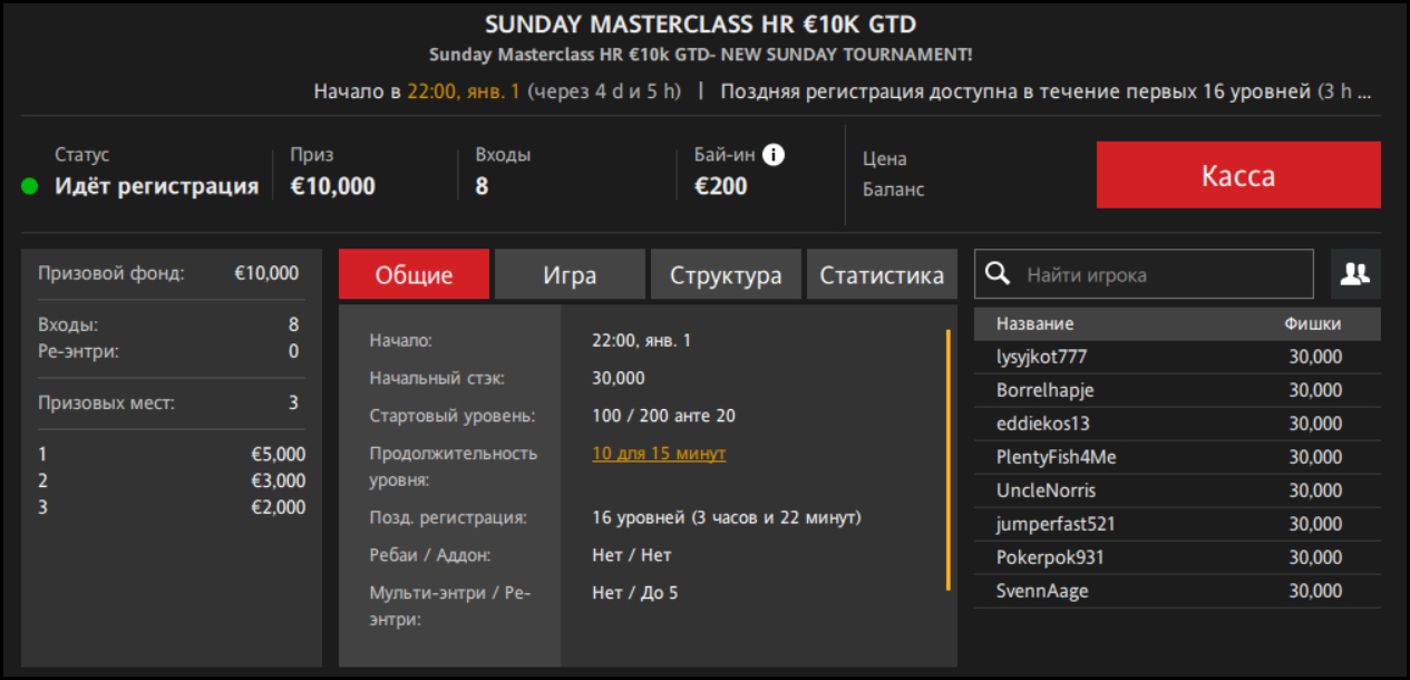 Сателлиты в турнир стоят €10, €15 и €20 — их расписание находится в турнирном лобби.