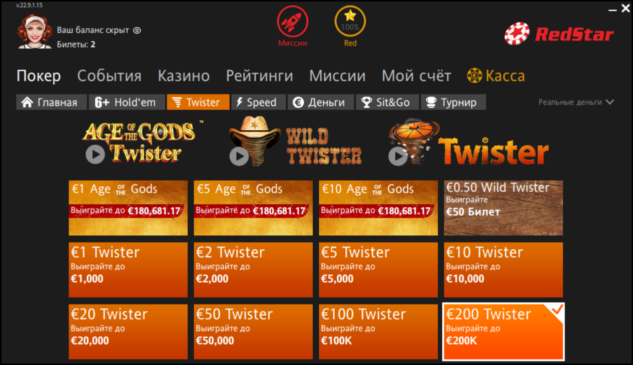 Теперь в лобби RedStar Poker доступны Твистеры от €0.50 до €200 с джекпотами от €1К до €200К.