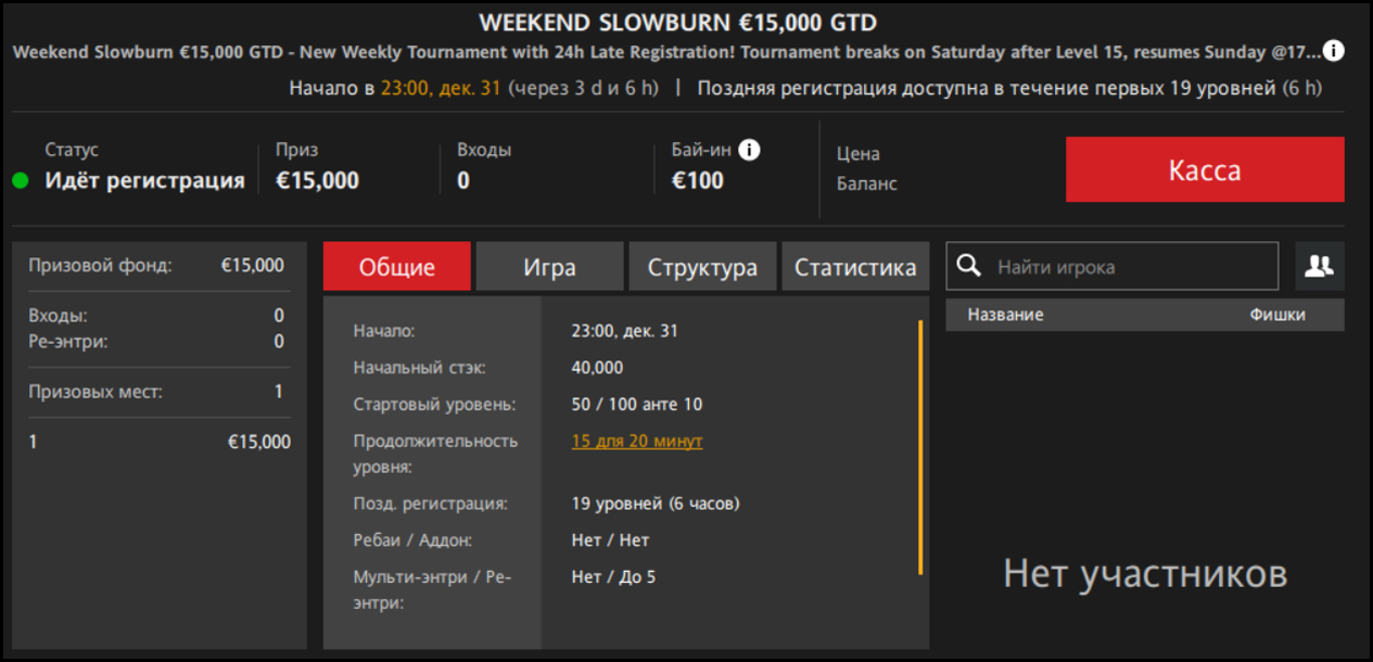 - Уровни блайндов — 15 минут до конца лейтреги, 12 и 10 минут после;