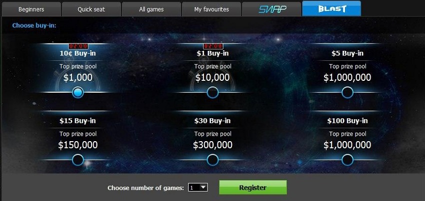Турниры BLAST на 888poker являются аналогами Spin`n`Go. Это супертурбированные турниры с 3 участниками (до недавнего времени было 4 игрока), где длительность уровней зависит от выпадаемого множителя.