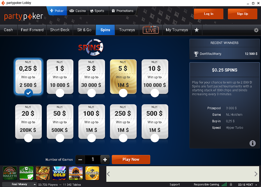 На partypoker также представлена обширная линейка лимитов в Spin`n`Go. Спины на partypoker привлекают более плавной структурой и меньшим рейком. Из минусов ― отсутствие возможности воспользоваться программами по сбору статистики.