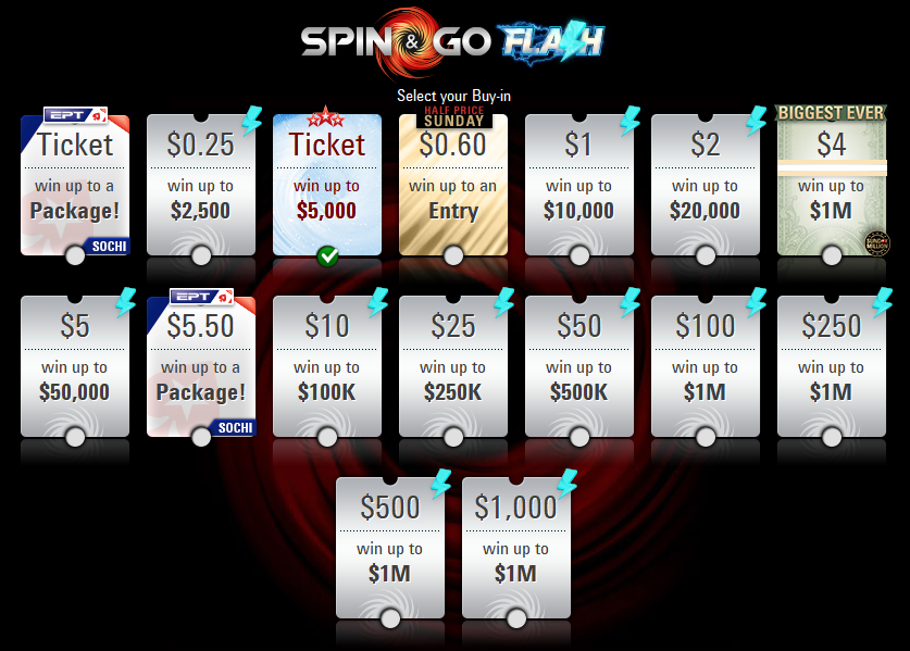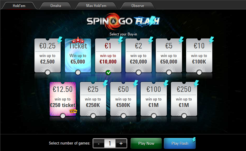 На испанской версии PokerStars также имеются турниры формата Spin`n`Go. Любой лимит с денежным призовым фондом можно выбрать в турбированном формате Flash.