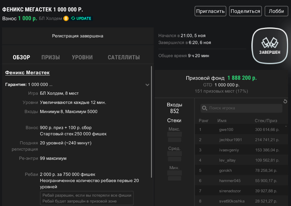 | Сателлит | ₽6К ре-энтри | 2 х ₽66К Ивент | Суббота 22:00 |
