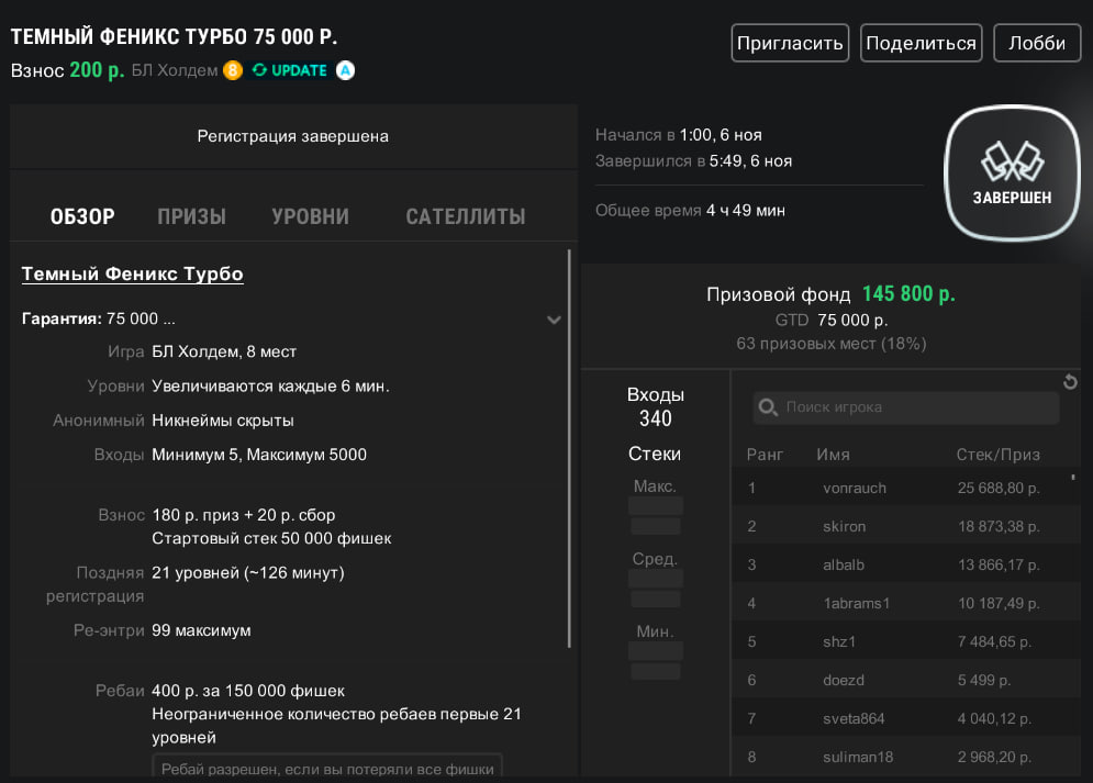 | Тёмный Феникс Турбо | ₽200 | ₽75,000 | 23:00 |