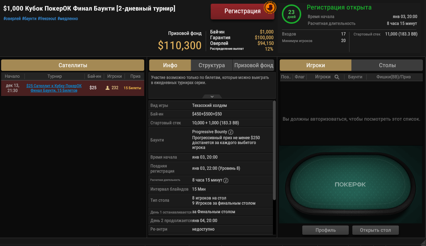 Фактически, с декабря 2025 турнир с денежными призами остался один — $1,000 Кубок ПокерОК Финал Баунти $100,000 Gtd на два дня.