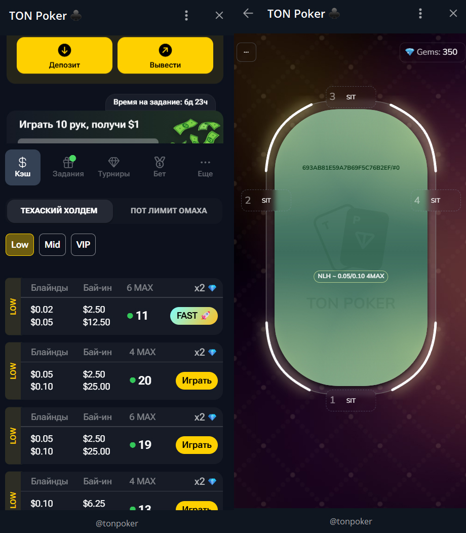 Также на TON Poker в 2025 году перестали проходить регулярные турниры — им на смену пришли акционные с бай-инами во внутренней валюте рума гемах (gem), которая зарабатывается за уплату рейка в кеше.