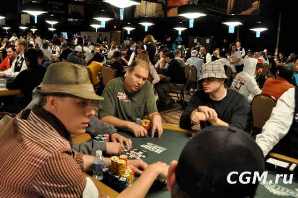 Закончил третий день мейна со стэком 348.800. Складывалось, как можно сообразить, довольно хорошо. С самого начала выиграл несколько средних банков и с 144 тысяч раскрутился до 300. Потом проиграл очень крупную раздачу за банк около 140 тысяч, выставившись на флопе QT3ss с QT против AsJs - Терном ему сразу закрыли флэш и я вернулся к тому, с чего начинал. Немного оправившись, я снова вошел в колею и начал заново набивать стэк (играл сегодня вполне себе ничего, не было нитовости первых двух дней). Благо, сеты раздавали довольно часто.