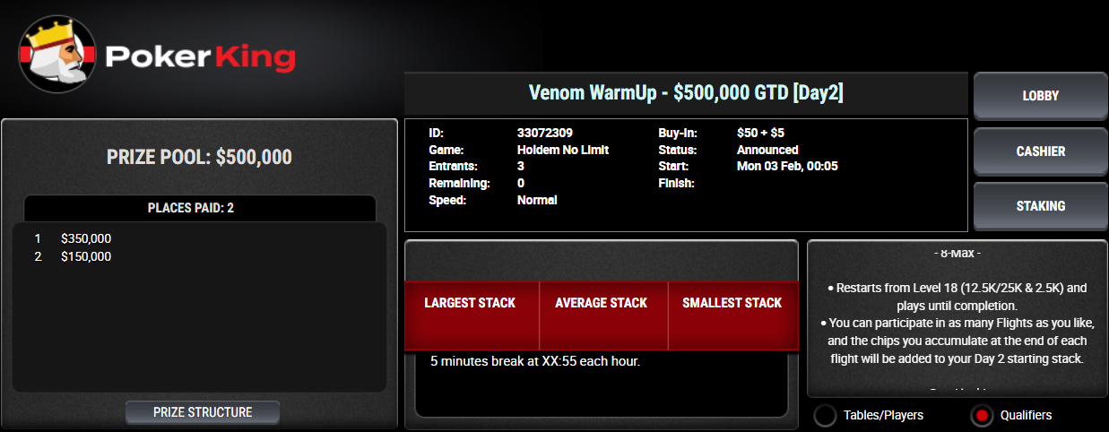 Первым на PokerKing с 12 января по 3 февраля пройдёт «разогревочный» мультифлайтовый турнир $55 Venom Warmup с гарантией $500,000.