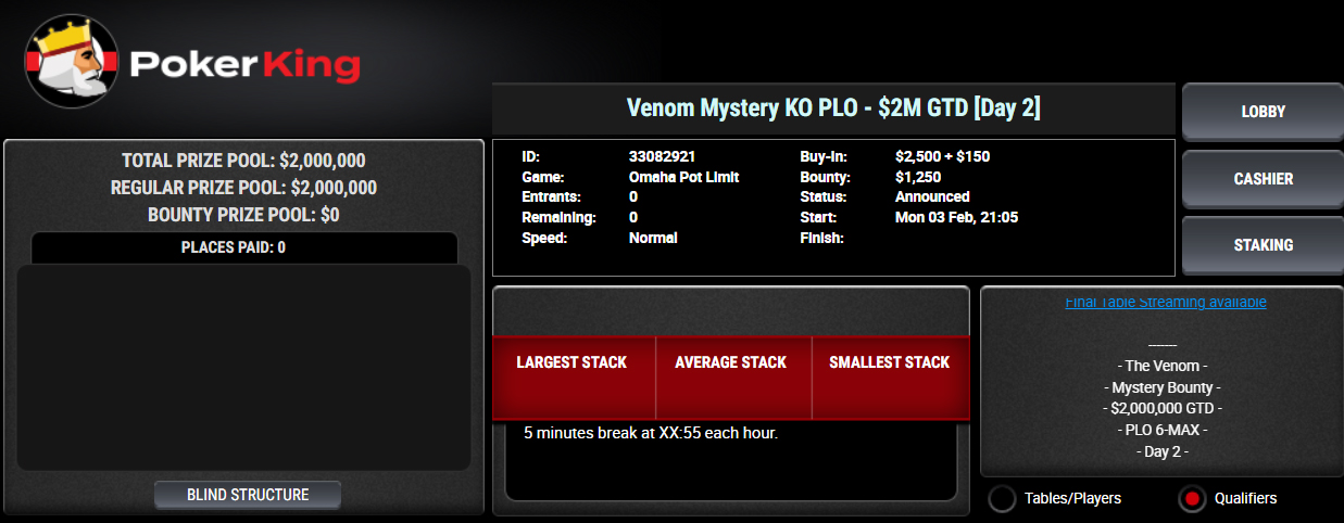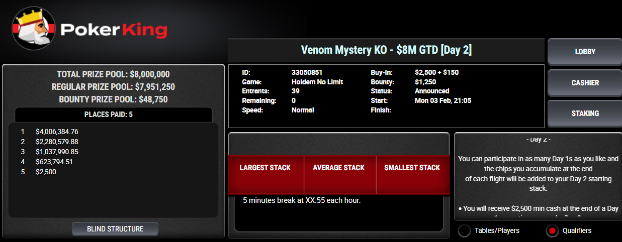 Venom Mystery Bounty NLH за $2,650 с гарантией $8,000,000 пройдёт на PokerKing с 19 января по 4 февраля. В расписании — пять входных дней:
