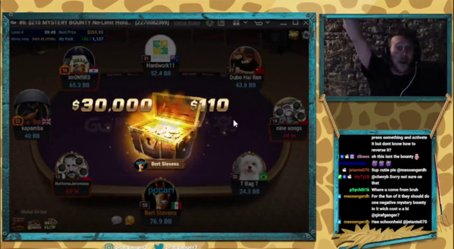 Кстати, билеты туда ПокерОК также раздавал в виде наград Mystery Bounty — один из них на стриме выпал бельгийцу, фермеру и регуляру хайроллерских турниров Берту «girafganger7» Стивенсу.