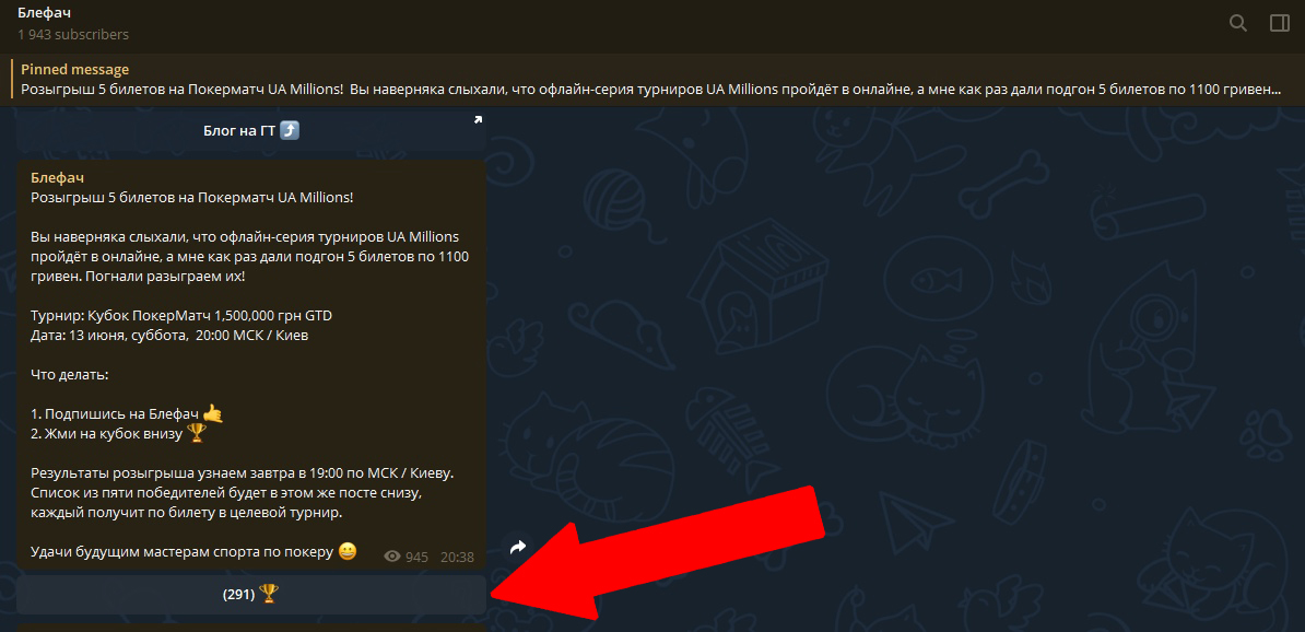 Вы еще можете успеть выиграть свой билет — для этого перейдите по ссылке розыгрыша от Блефача, подпишитесь на канал и нажмите на кубок под выделенным постом.