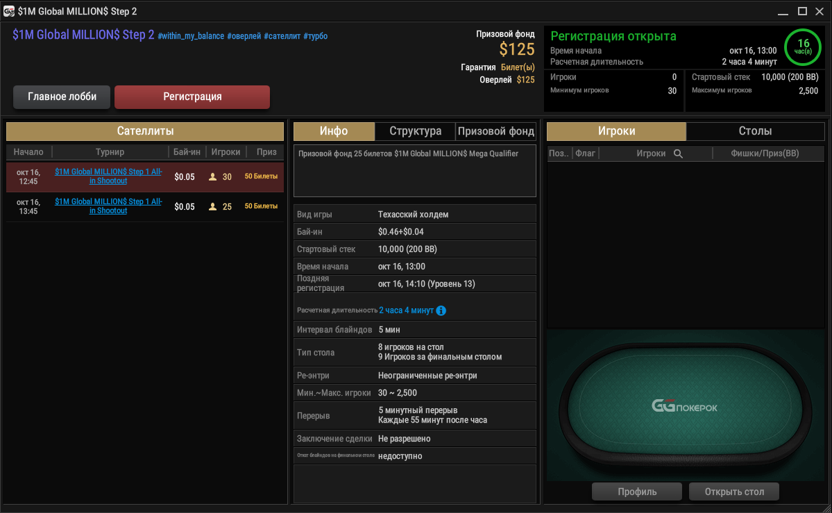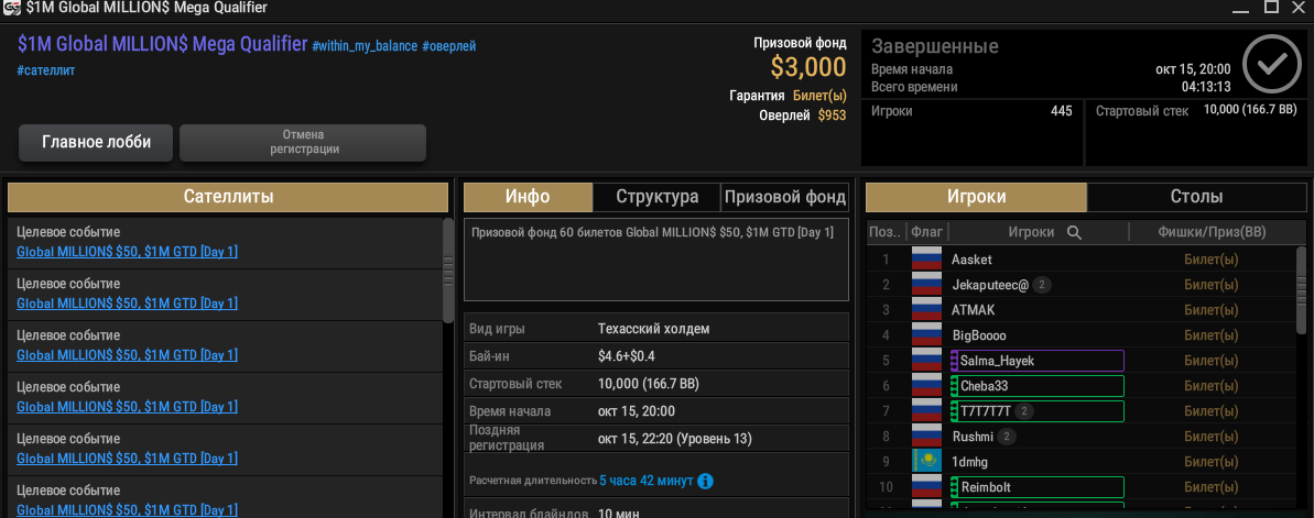 — Сателлиты $1M Global MILLION$ Step 2 проходят с призовым фондом $125 — если вы попадёте в топ-25, то получите билет по $5 на следующий степ-сателлит, где разыгрываются входы в целевой турнир с гарантией $1,000,000. Сателлит по $5 стартует 1 раз в день в 20-00 МСК с гарантией 60 билетов ($3K) с приличным оверлеем. Для примера выкладываем скриншот пятничного Мега сателлита, в нем оверлей составил $1K (треть гарантии).