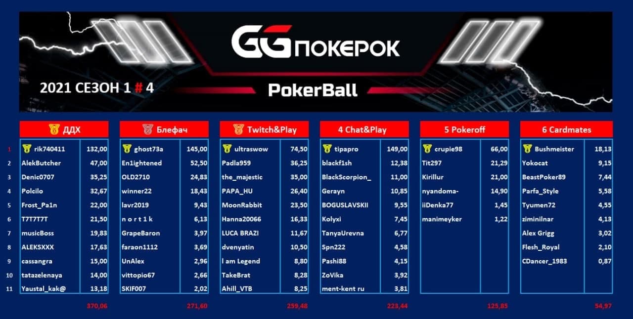 На момент публикации материала первое место уверенно занимает команда ДДХ покер, у которой в активе 370 очков. Данные актуальны по результатам четвертого игрового дня.