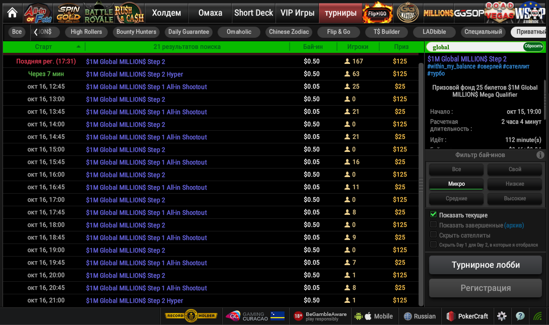 — Играете ежедневные турниры $1M Global MILLION$ по $0,50 — ищите их во вкладке Турниры > Приватные. Ежедневно их проходит по 8 штук, но учтите, что результат в командном и личном зачёте учитывается только из вашего лучшего турнира. Если в одном турнире вы получили 25 очков, а в другом 30, то учитываться будет только лучший результат.