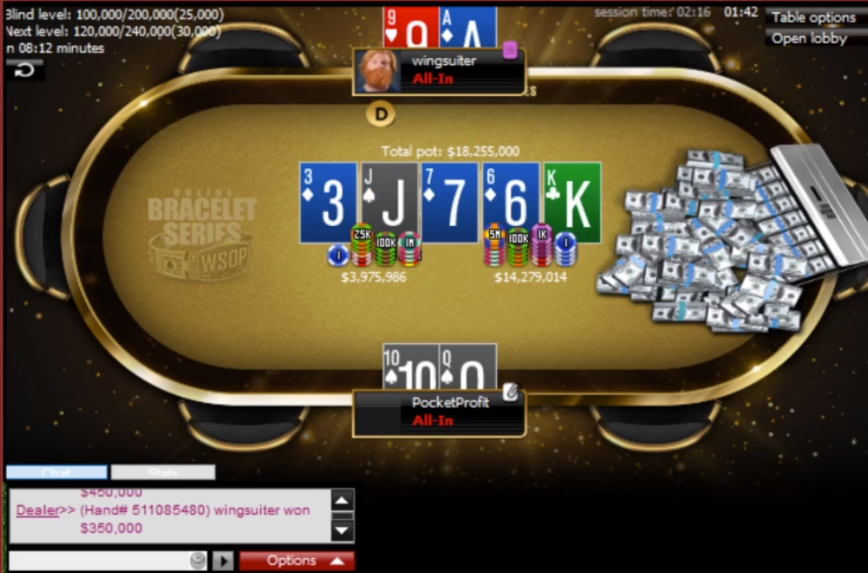 wingsuiter вышел в хедз-ап с пятикратным преимуществом по фишкам против Джастина «PocketProfit» Вонга — 32-летнего бухгалтера из Нью-Джерси. Но завоевать браслет, как это сделал его коллега в 2003, Вонгу не удалось.