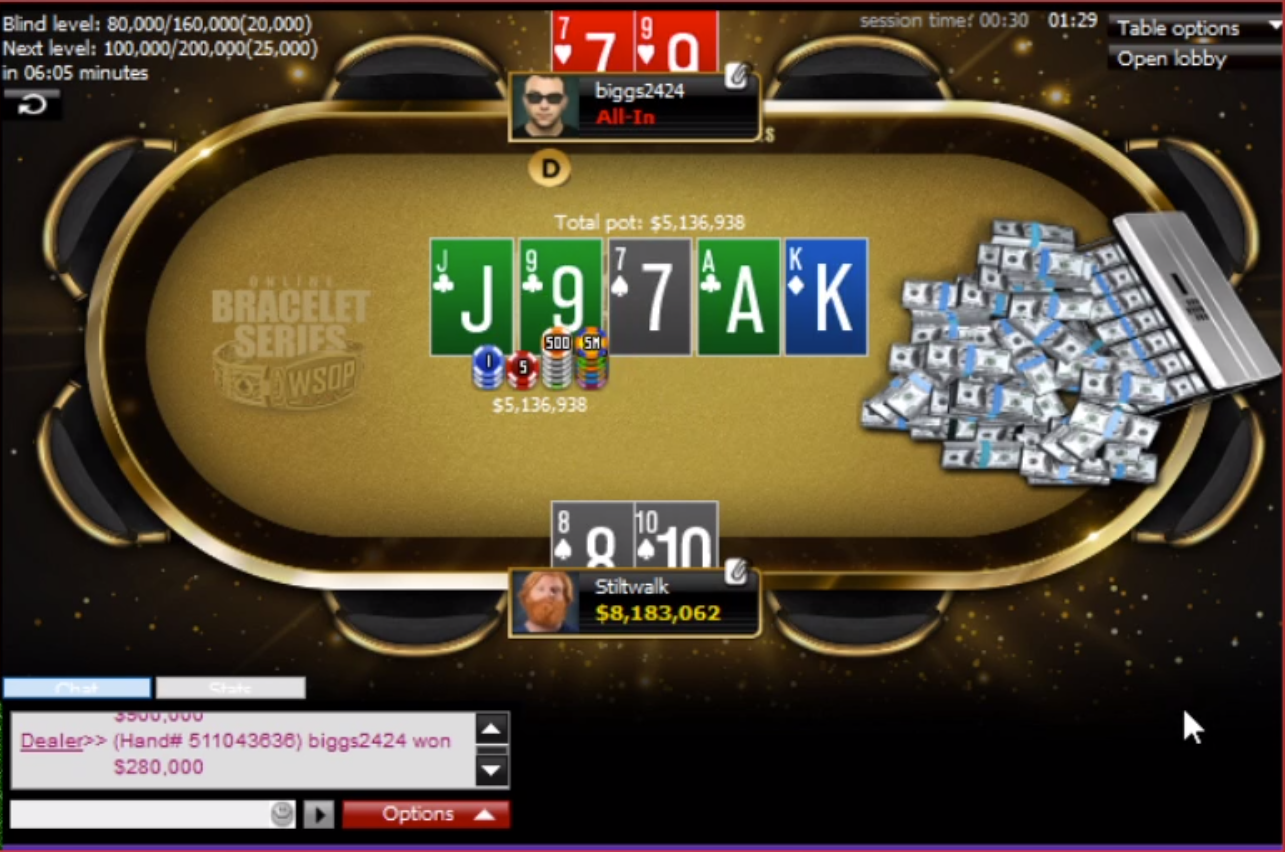 В финальной раздаче в рейженом поте ГСЧ WSOP.com раздал соперникам готовый стрит против двух пар, отскочить в этой глубине (16 BB) было невозможно. Stiltwalk со стритом сыграл чек-колл на флопе и чек-колл овербет олл-ина на терне.