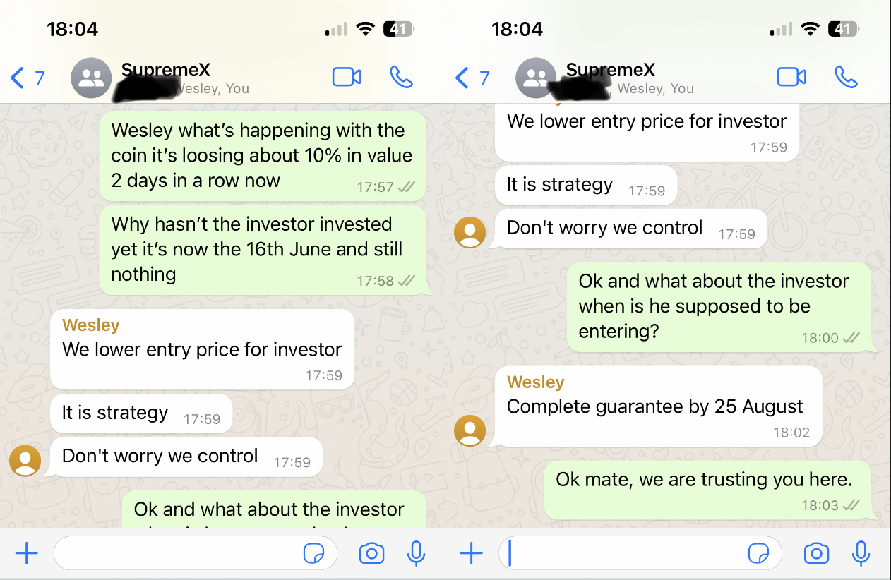 - Если Уэсли не был связан с SupremeX, почему он убеждал придержать монету до 25 августа, пока не придёт крупный китайский инвестор и не увеличит цену монеты?