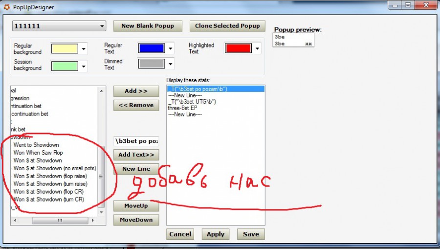Чем больше W$SD тем реже блефует наш оппонент и до вскрытия доходит с более сильными руками. Вам необходимо добавить в попап W$SD (Flop raise) и другие. Благодаря им вы сможете видеть как часто ваш противник выигрывает на шоудауне когда на флопе или тёрне он сделал рейз или чек/рэйз.