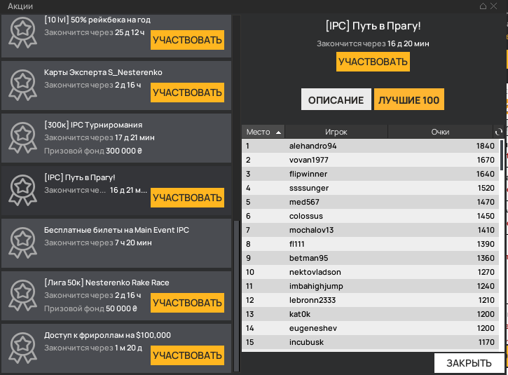 Параллельно с Турнироманией, вы можете побороться за дополнительные призы от Покерматч — пакет участника EPT Prague 2021 в декабре. За попадание в топ-5 любого события IPC вам также будут начисляться отдельные очки и пять лучших игроков IPC станут победителями.
