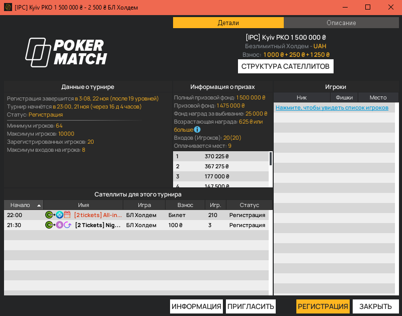- Главное событие ₴2500 Kyiv PKO с гарантией 1,5M ($57K) состоится 21 ноября