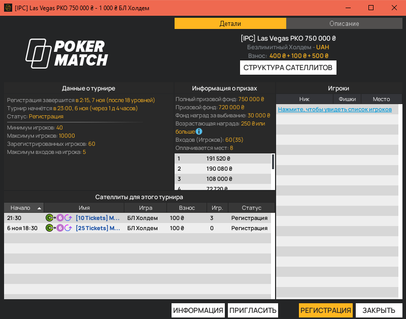 - 20:00 МСК — ₴250 Las Vegas NLHE ₴175K