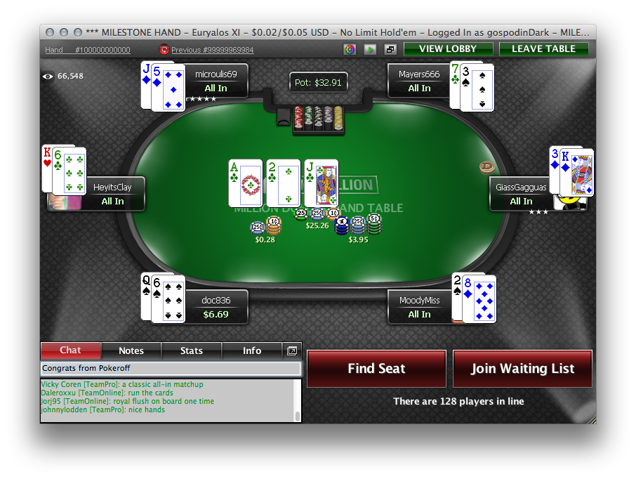 У двоих игроков оказывается флеш-дро, но лучшая рука у грека с J-5 и после открытия терна и ривера ничего не меняется.