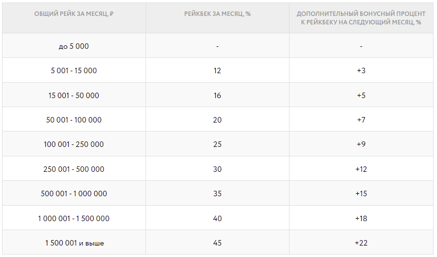 - Если игрок сделает ₽300,000 рейка: рейкбек составит 30% (₽100,000) + 7% (₽21,000). В следующем месяце бонусный рейкбек составит 12%.