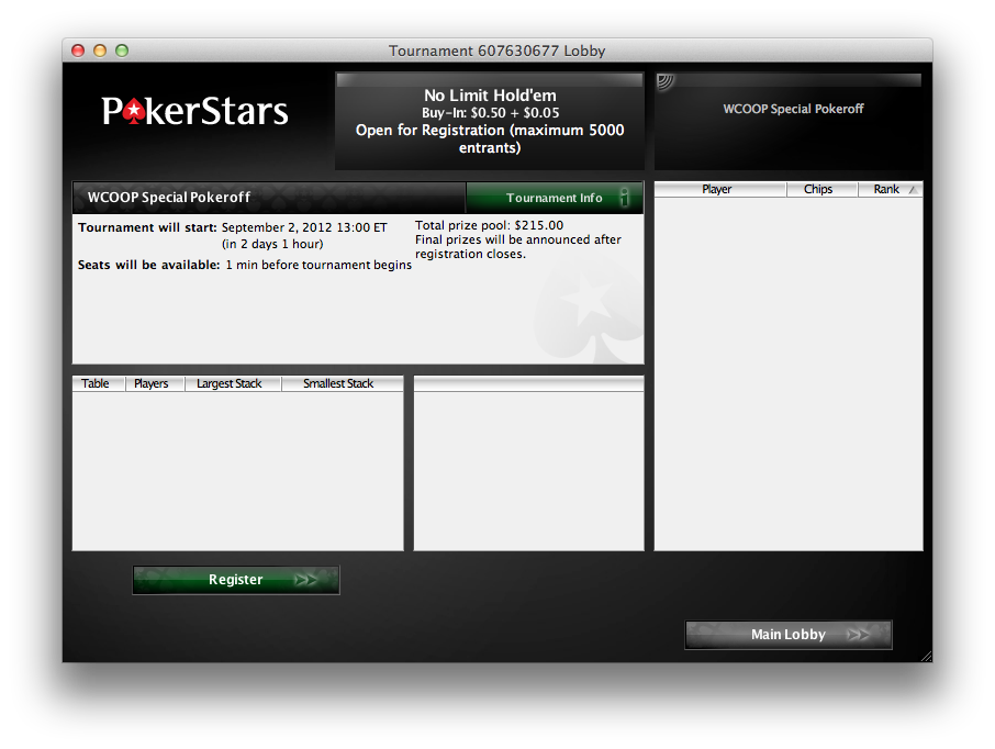 А теперь главное! Мы разыграем билет на PokerStars WCOOP, стоимостью $215. Турнир пройдет в воскресение в 21:00 по Москве и он уже заманчиво дразнит игроков в лобби комнаты. Тем не менее, пароль на турнир мы выложим за 30 минут до начала турнира на Покероффе.